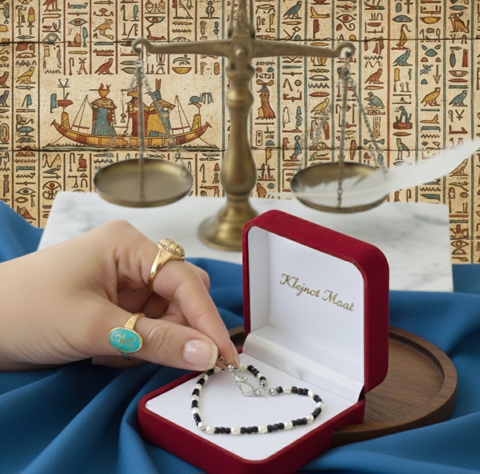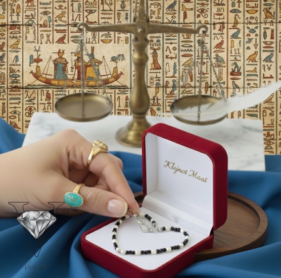 ,,Klejnot Maat" to nie tylko ozdoba. To przypomnienie, że prawadziwa miłość nie jet ślepa, lecz ma oczy otwarte na prawdę, sprawiedliwość i wzajemny szacunek. To bransoletka dla osoby, która wierzy w miłość opartą na harmonii, równowadze i autentyczności. Nosząc ją, poczujesz na nadgarstku dotyk starożytnej miłości, która prowadzi Twoje serce ku głębszej i prawdziwszej formie uczucia, zawsze utrzymując jego wagę w idealnym balansie.