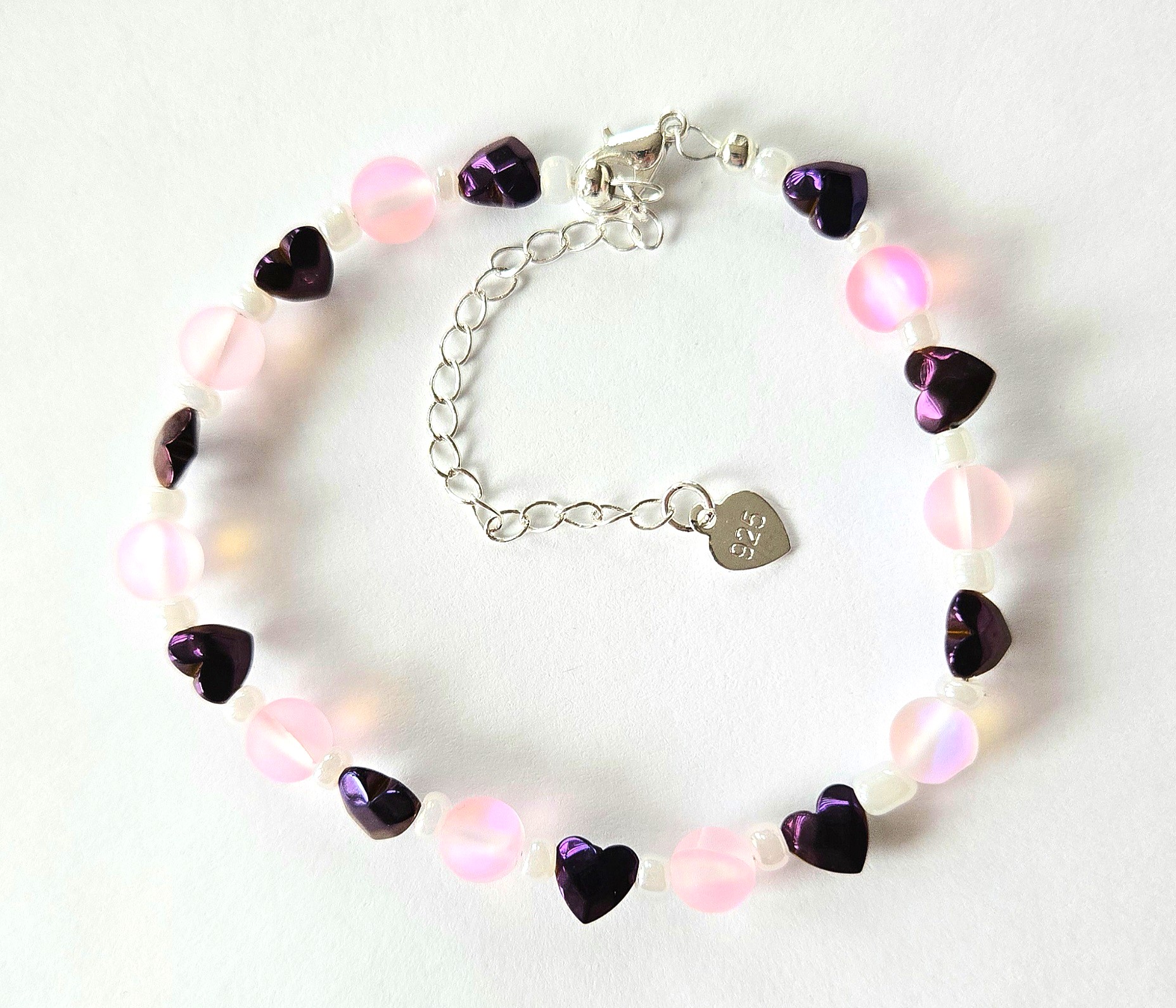 • Materiały: Różowy hematyt (serca), Jasnoróżowy spektrolit (kuleczki), Akryl jubilerski (kolor biały).
