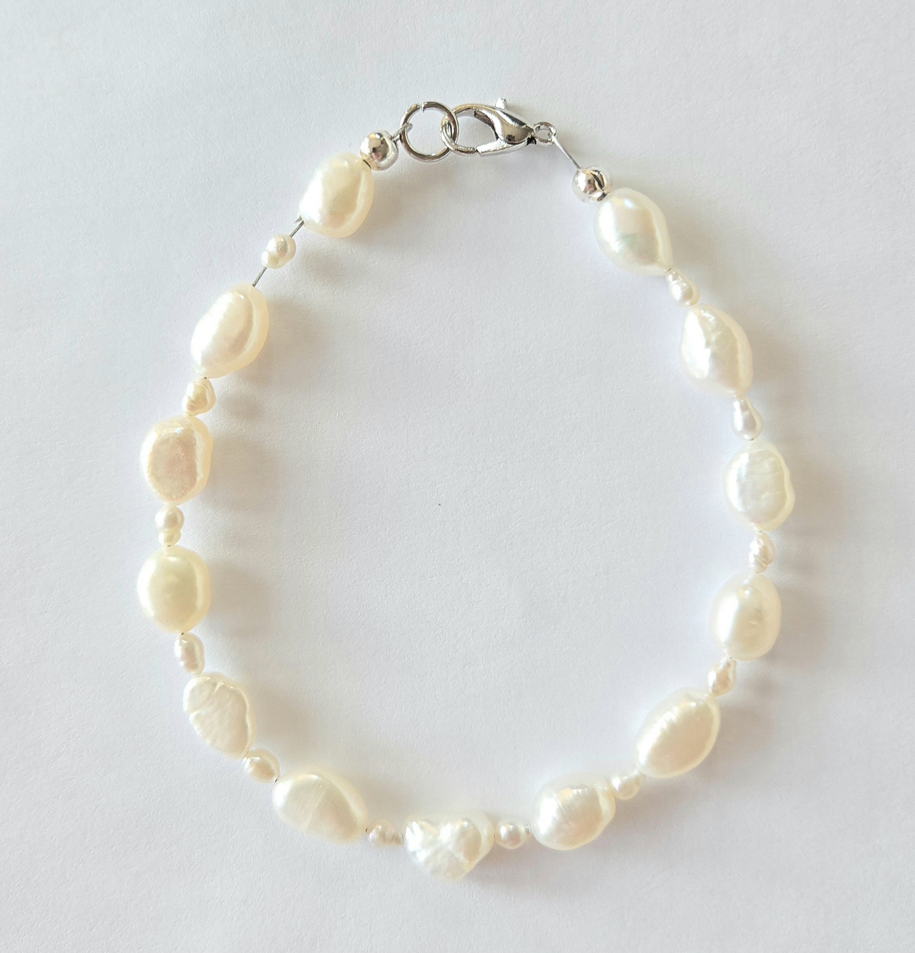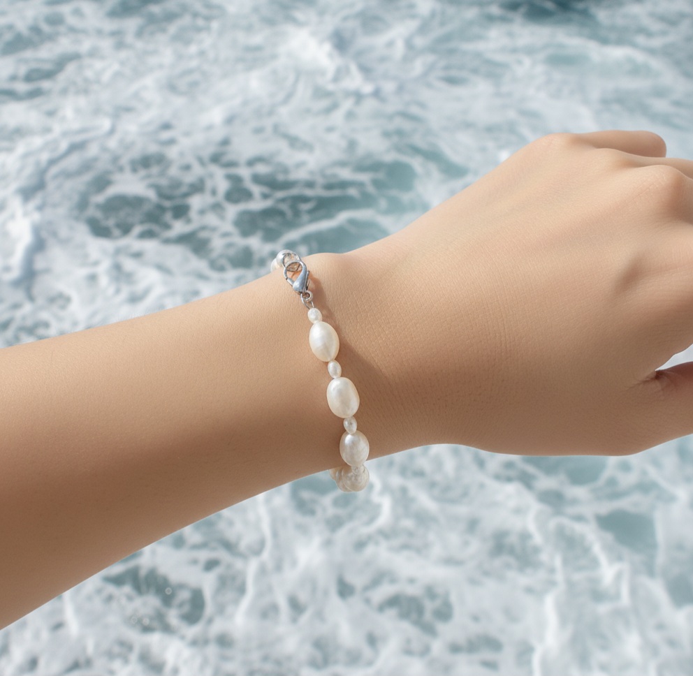 W naszej bransoletce zrezygnowaliśmy z monotonii na rzecz dynamicznej kompozycji. Połączenie pereł o dwóch różnych średnicach tworzy ciekawy efekt wizualny – mniejsze perły dodają konstrukcji lekkości, podczas gdy większe stanowią wyraźny, luksusowy akcent. To biżuteria, która żyje przy każdym ruchu ręki, przyciągając spojrzenia swoją nieoczywistą strukturą.