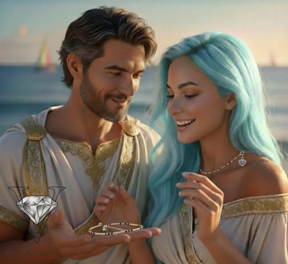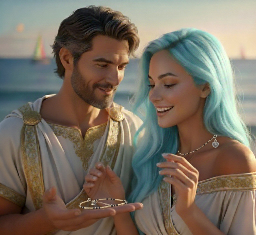 Więc Posejdon, w najwspanialszym geście, wyrzeźbił z lapis lazuli naszyjnik i bransolety. Kiedy wręczał je Tetydzie, fale zamilkły, a wszystkie stworzenia morskie wstrzymały oddech. Zakładając jej biżuterię, poczuł dotyk jej skóry. Lapis lazuli na jej ciele lśnił jak miliony gwiazd w najczystszym, nocnym niebie. To był klejnot nie tylko ozdobny, ale symboliczny. Niebieskie tło kamienia reprezentowało nieskończoność i spokój morza, a złote żyłki były obietnicą przyszłości, pełnej miłości i szczęścia.