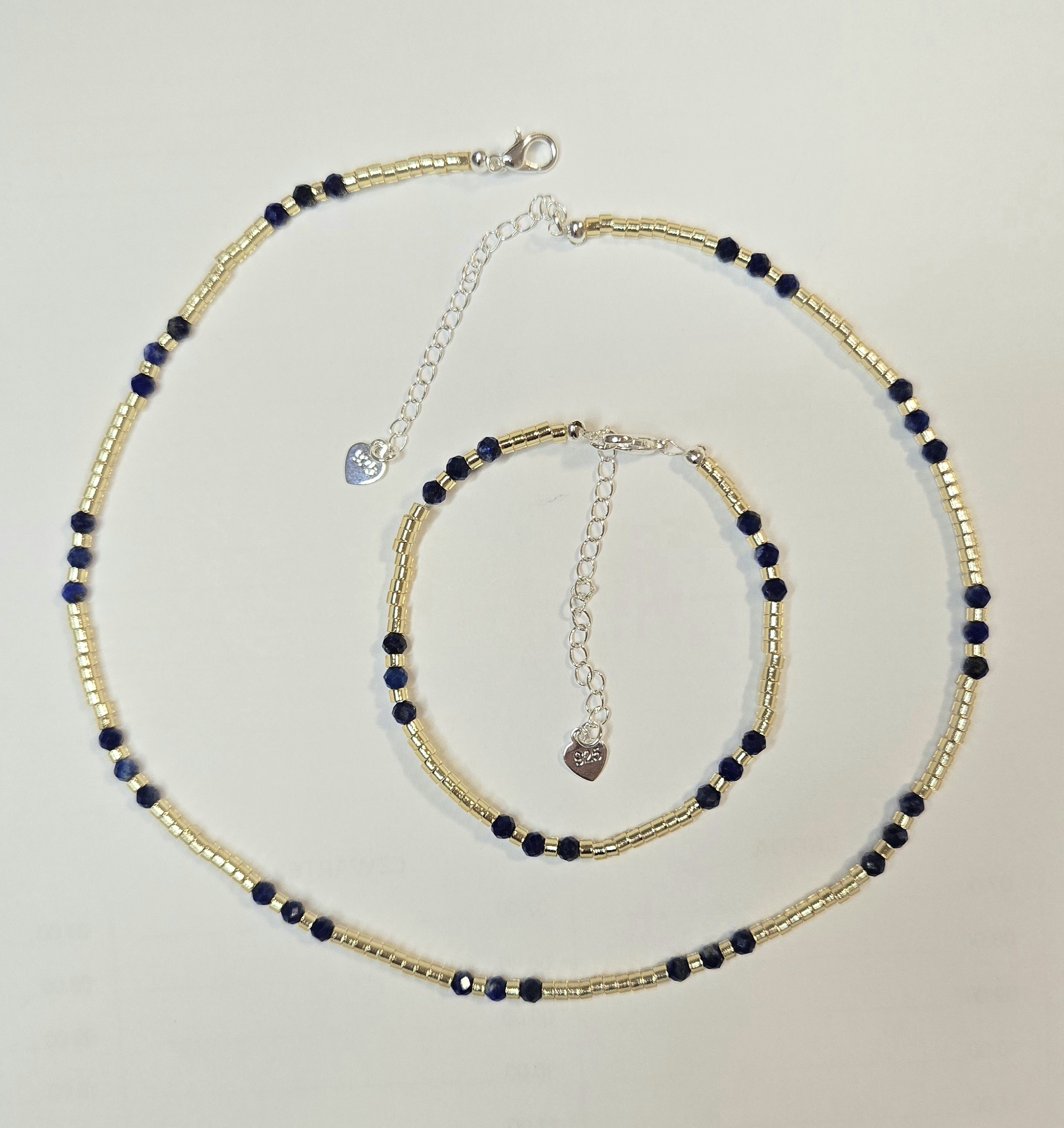 KOMPLET: NASZYJNIK I BRANSOLETKA Z LAPIS - LAZULI ZE SZKLANYMI PRZEKŁADKAMI
