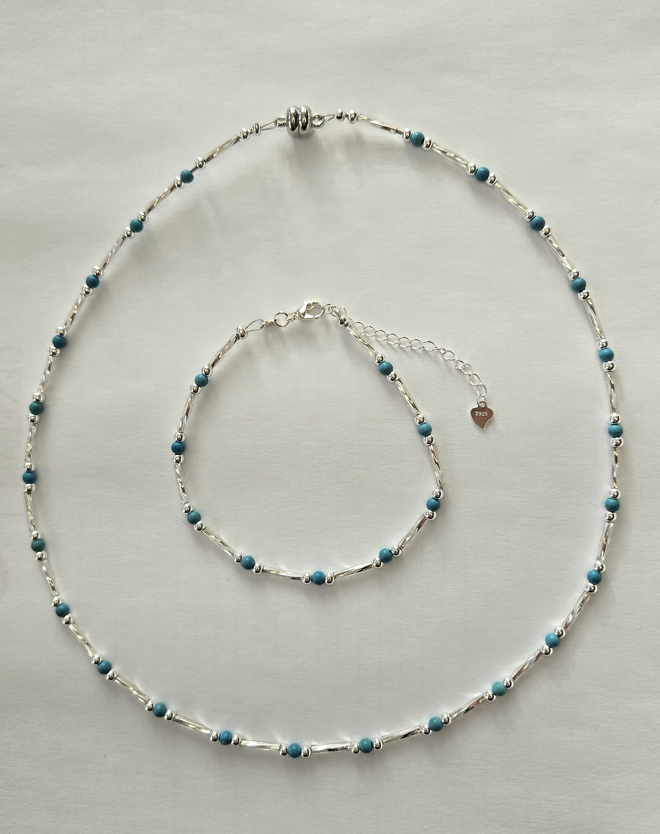 • Materiały: Turkusowe kuleczki (syntetyczne lub naturalne – zgodnie z Twoim asortymentem), szklane przekładki w kolorze srebrnym, stal szlachetna antyalergiczna.