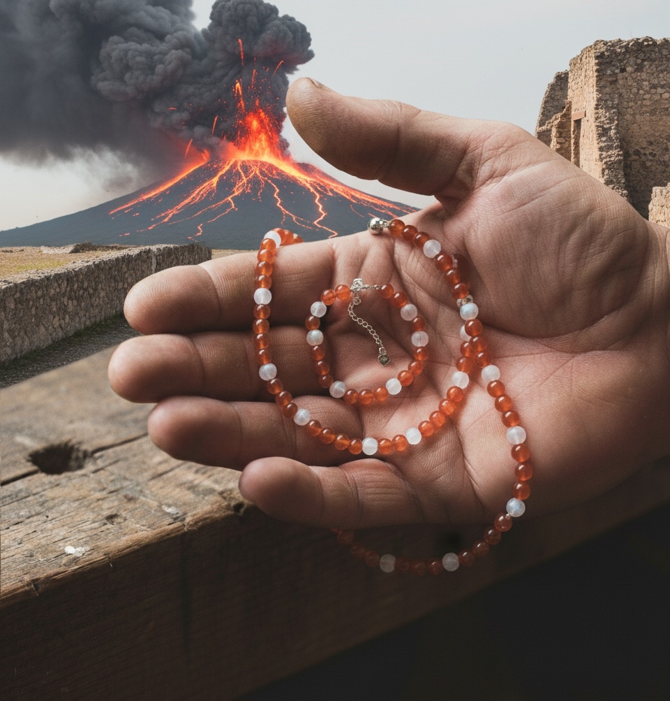 Nasza nowa biżuteria zainspirowana kulturą starożytnego Rzymu i jego imperium to naszyjnik i bransoletka z kamieni przeziernych, ale o barwie przynoszącej na myśl czerwień lawy, która strawiła piękne miasto, Pompeje. Wyobraźmy sobie...