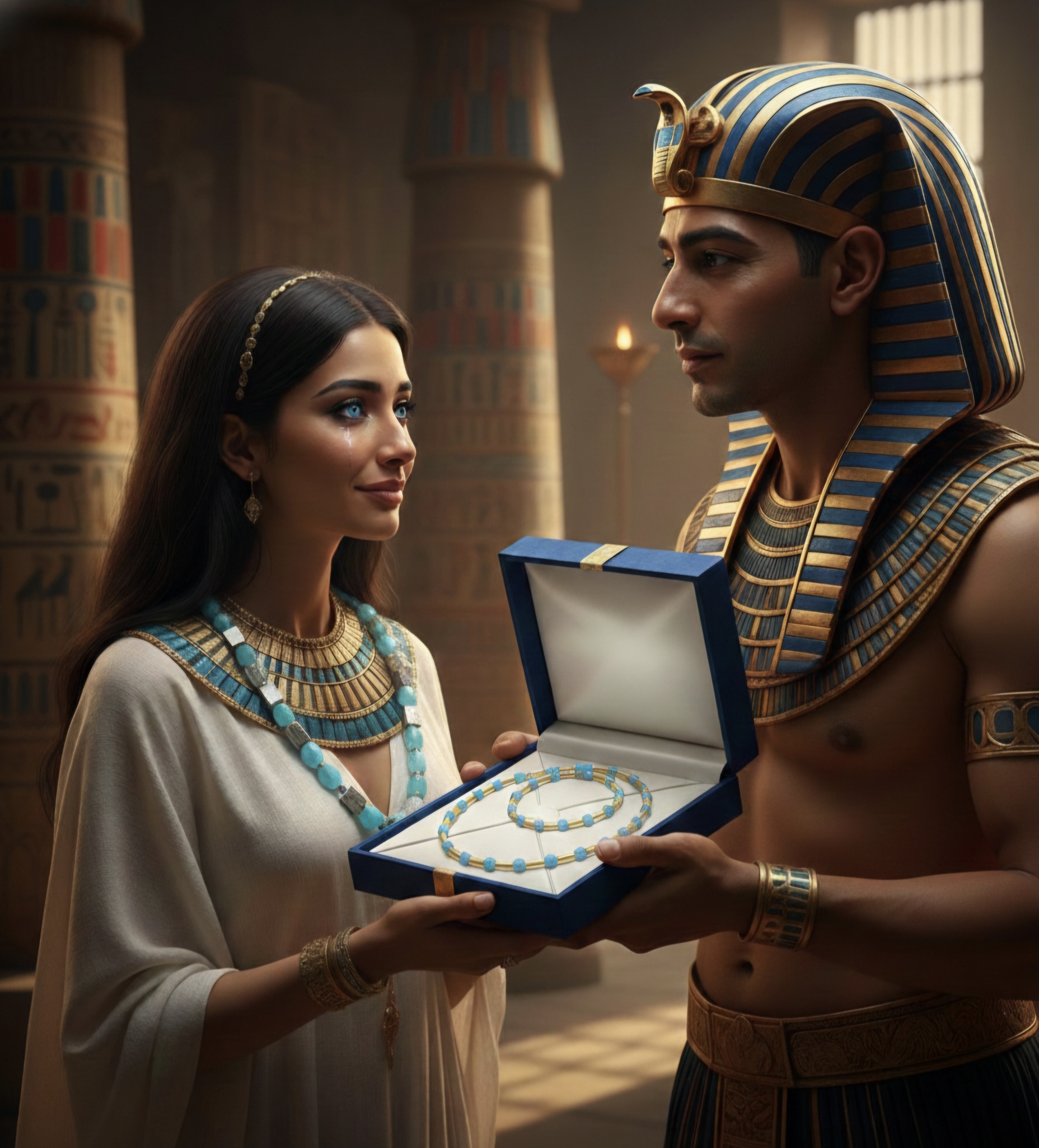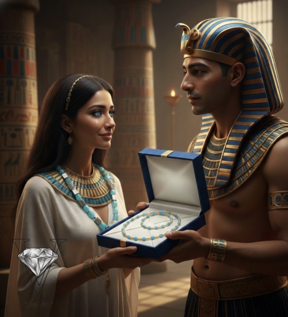Anchesenamon, wzruszona do głębi, przyjęła prezent, a błękit biżuterii idealnie współgrał z blaskiem jej oczu. ,,Gest Faraona" stał się symbolem ich niezwykłej miłości, opowieści o uczuciu, które przetrwało wieki, zapisane w kamieniu i lsniące jak woda oceanu, odzwierciedlając wieczność ich związku.