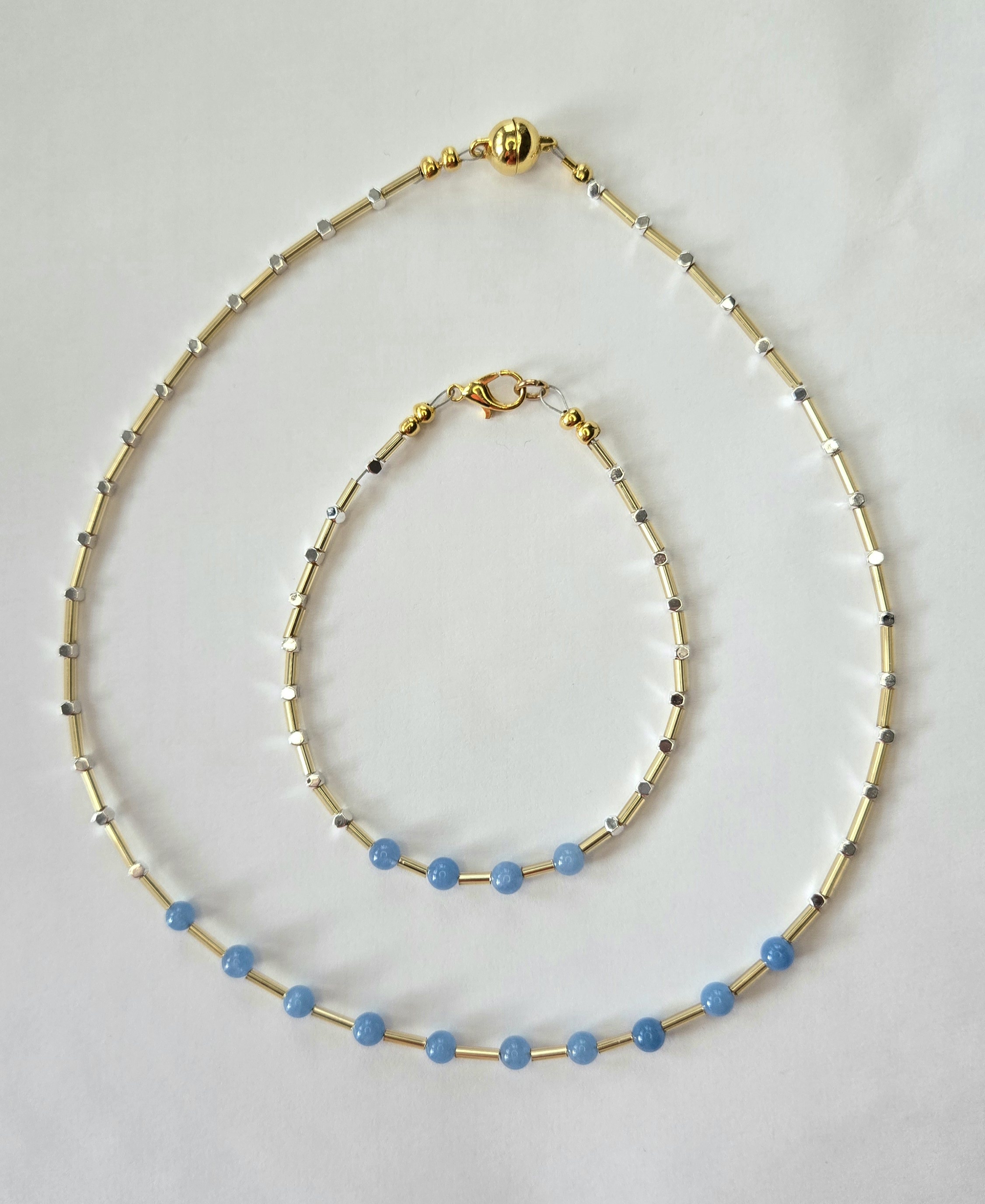 - Materiały: Naturalny akwamaryn (kuleczki), hematyt (srebrne kwadraciki), stal szlachetna premium.