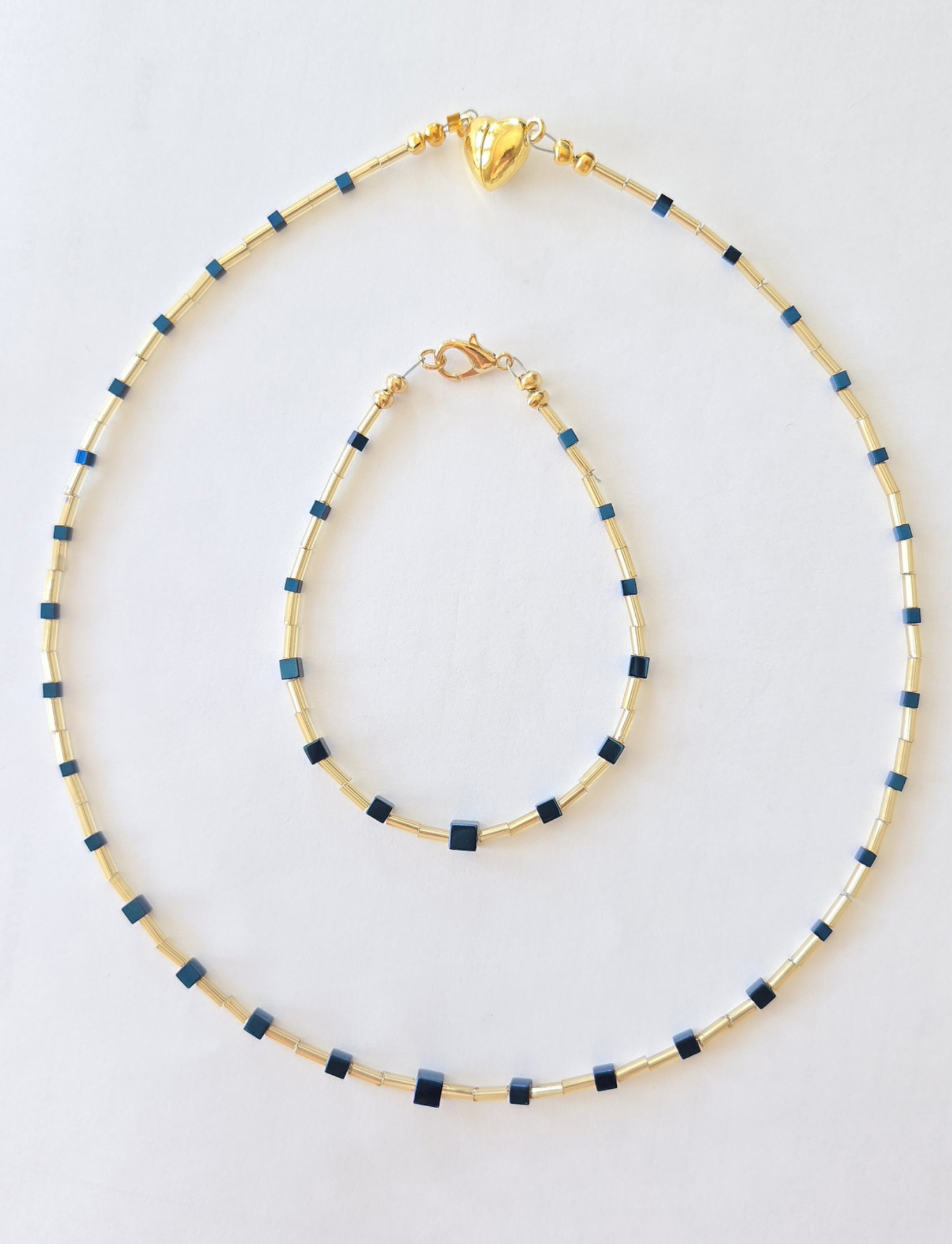 - Materiały: Hematyt naturalny (kolor niebieski/metaliczny), wysokiej jakości szklane przekładki w kolorze złotym.