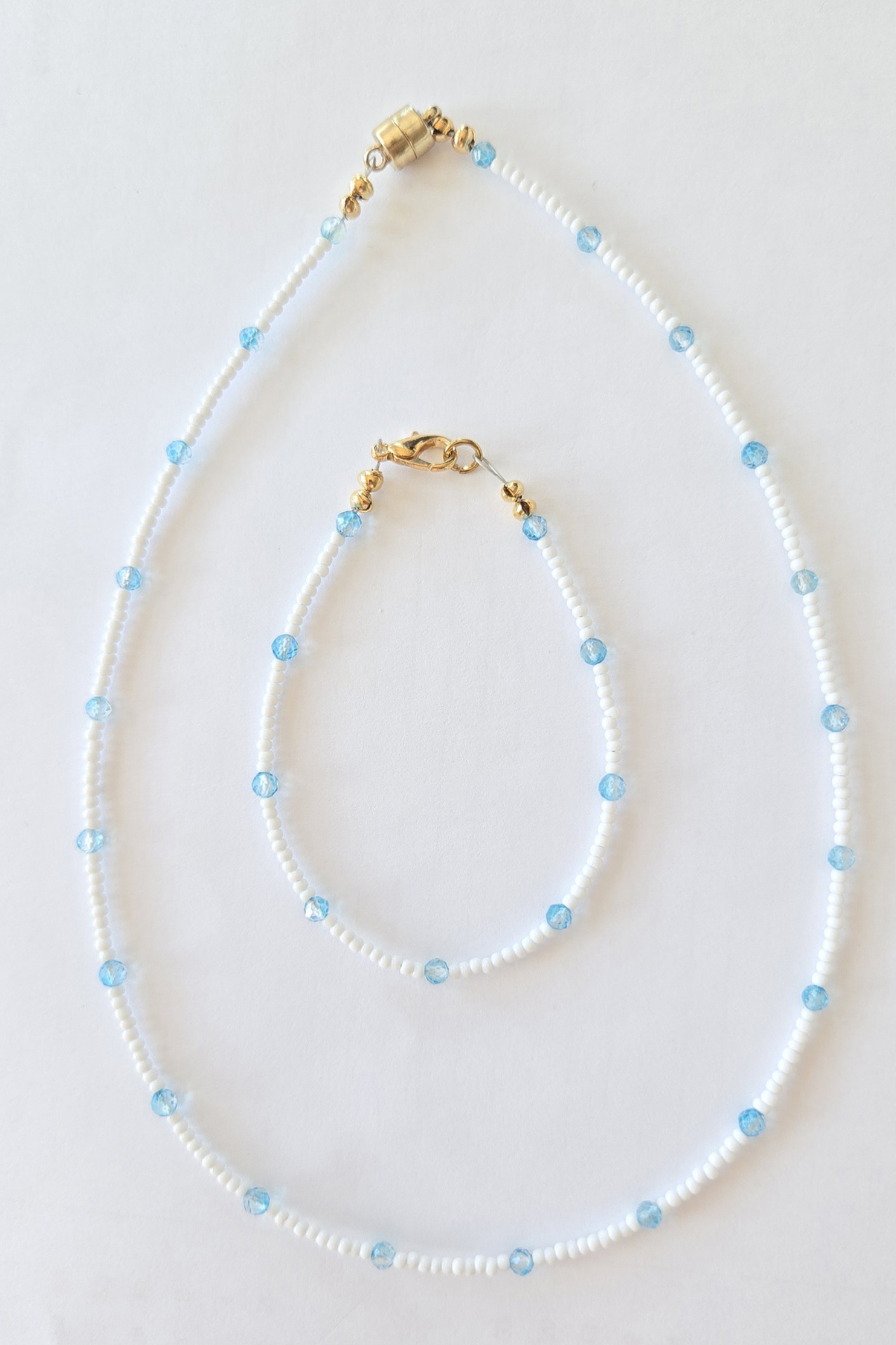 Ten uniwersalny komplet, składający się z naszyjnika i bransoletki, jest doskonałym dodatkiem do letnich stylizacji, jak i eleganckich wieczorowych kreacji. Doda blasku Twojej codzienności i podreśli Twój wyjątkowy styl, niezależnie od pory roku.