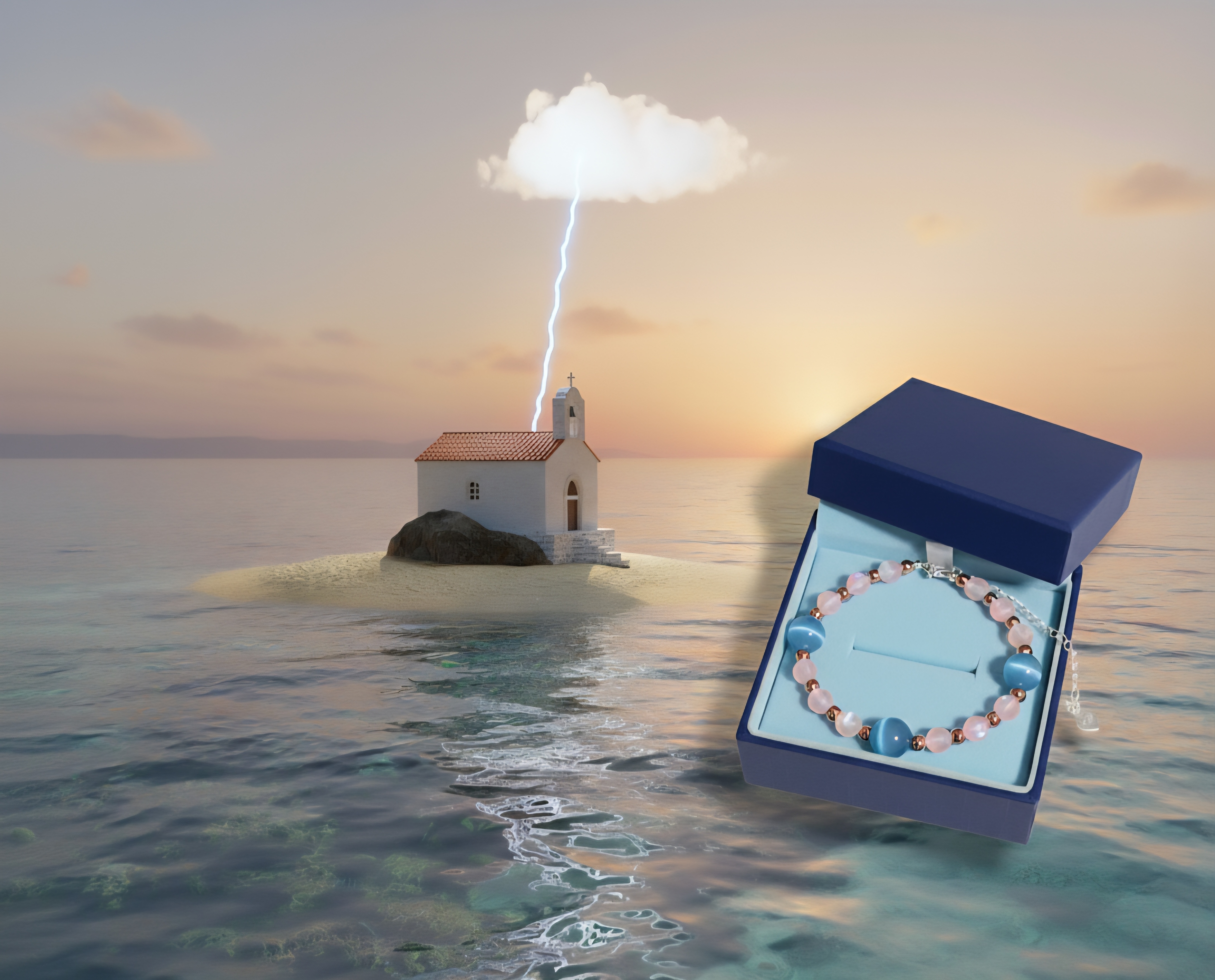 Kamienie chalcedonu w kolorze morskim przypominają kolor wody Morza Adriatyckiego, oblewające leżącą pośrodku maleńką wysepkę z jeszcze mniejszym kościółkiem. Błyszczał on w świetle zachodzącego słońca, niczym kamienie różowego hematytu pośród chalcedonu. Nad kościółkiem widoczna była jedna jedyna chmurka, niczym kamyczki spektrolitu, migocząc nad wieżyczką. Ku zaskoczeniu widowisko oglądane z wysokich gór było oszałamiające, gdyż z tej jedynej chmurki ukazała się widzom błyskawica, która pędząc z szybkością światła uderzyła w szczyt wieżyczki kościółka.