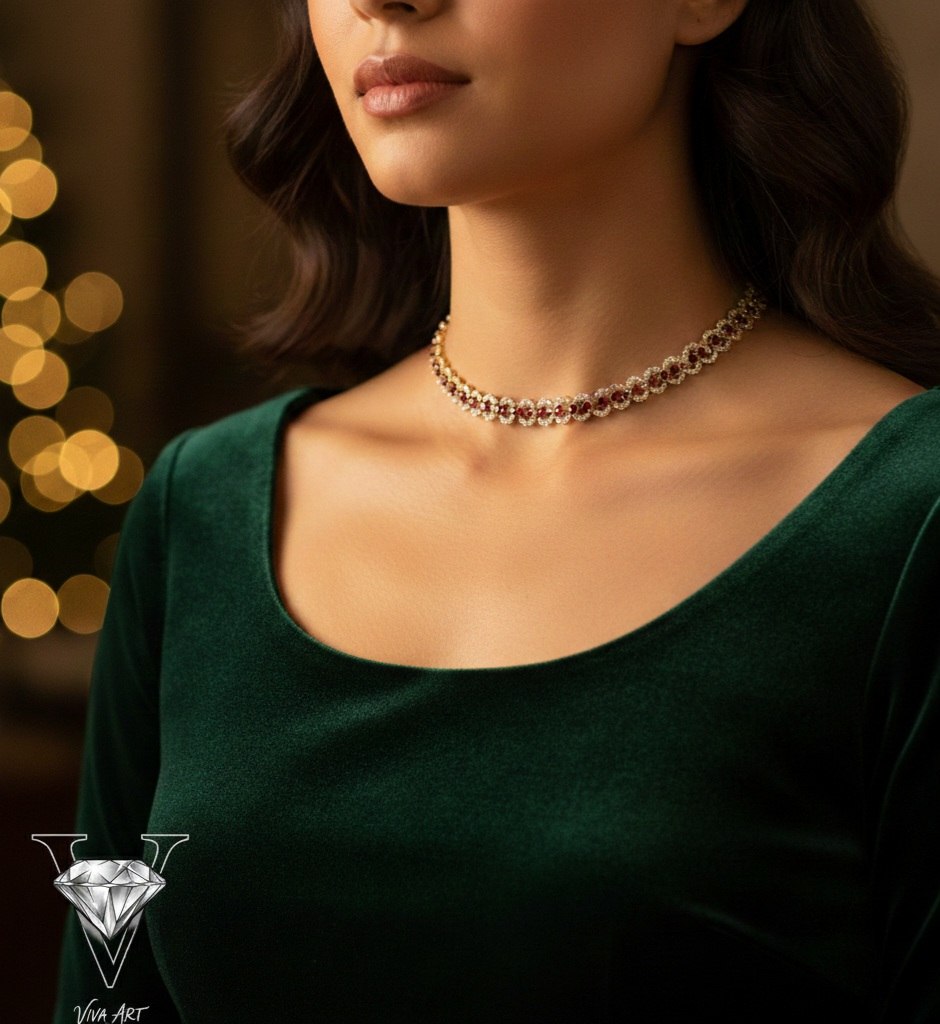 Krótki naszyjniki typu kolia lub chokery. Świetnie wyglądają tu też bogato zdobione naszyjniki statement, które układają się po łuku.